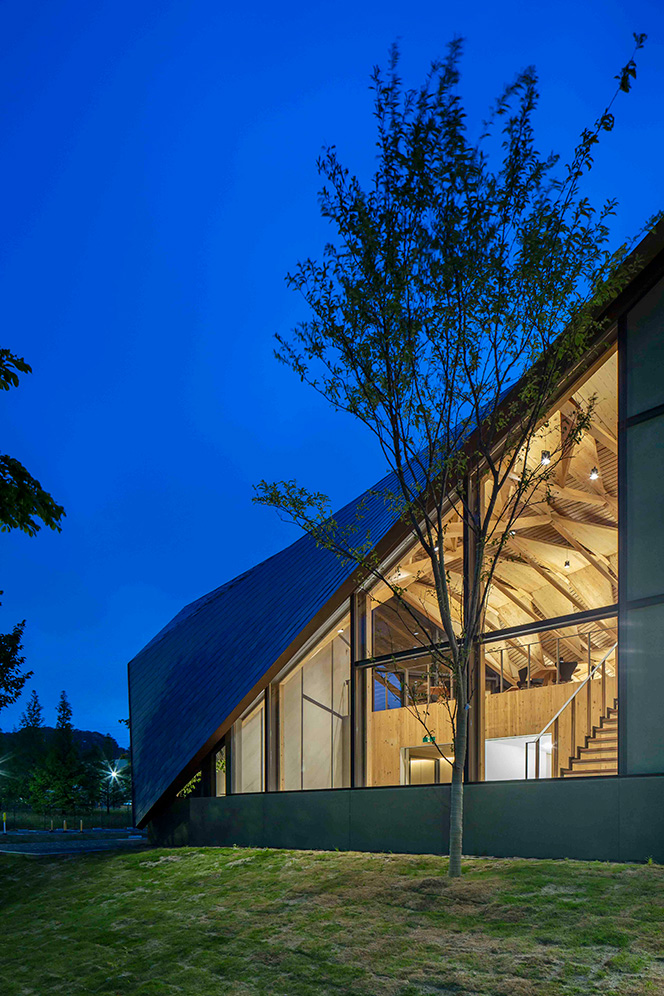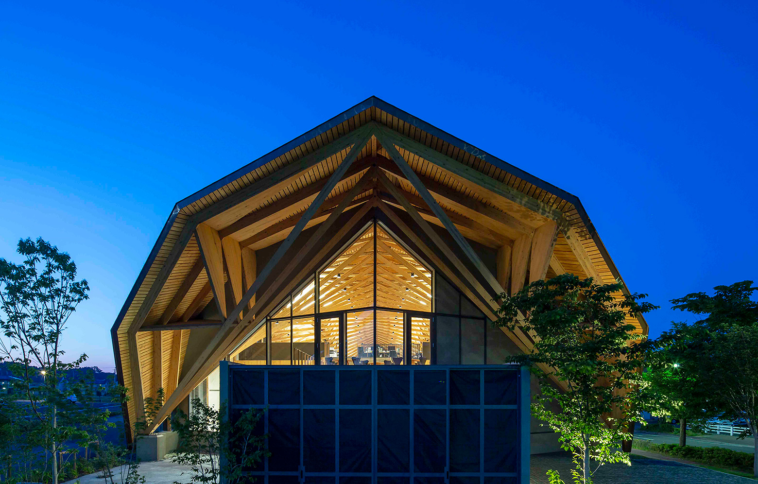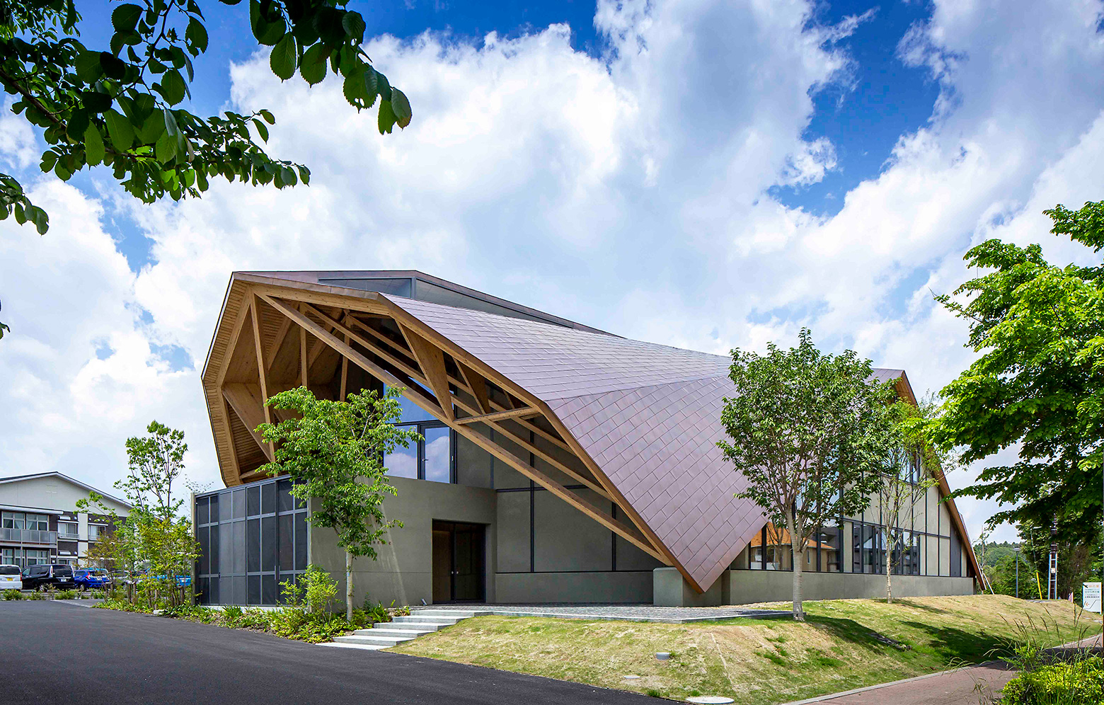 Fokus ligger på det geometriskt avancerade taket, som består av två lager med trianglar. Basen på de bredaste trianglarna löper hela vägen från långsida till långsida och består av ett fackverk med limträbalkar skapade av japansk tall. Dimensionen på dessa är 105x240 millimeter, en vanlig dimension i japanska hus. Ovanför fackverkets nedre del sitter två långa rader med triangulära KL-träskivor av japansk ceder, likt två fågelsträck som sänker sina vingspetsar från toppen av taket och ner mot limträbalkarna. Där vingspetsarna träffar balkarna knyts de båda elementen samman med förband i såväl mittlinjen som i två yttre linjer. Under de båda konstruktionerna är taket klätt med en längsgående panel av europeisk rödtall.