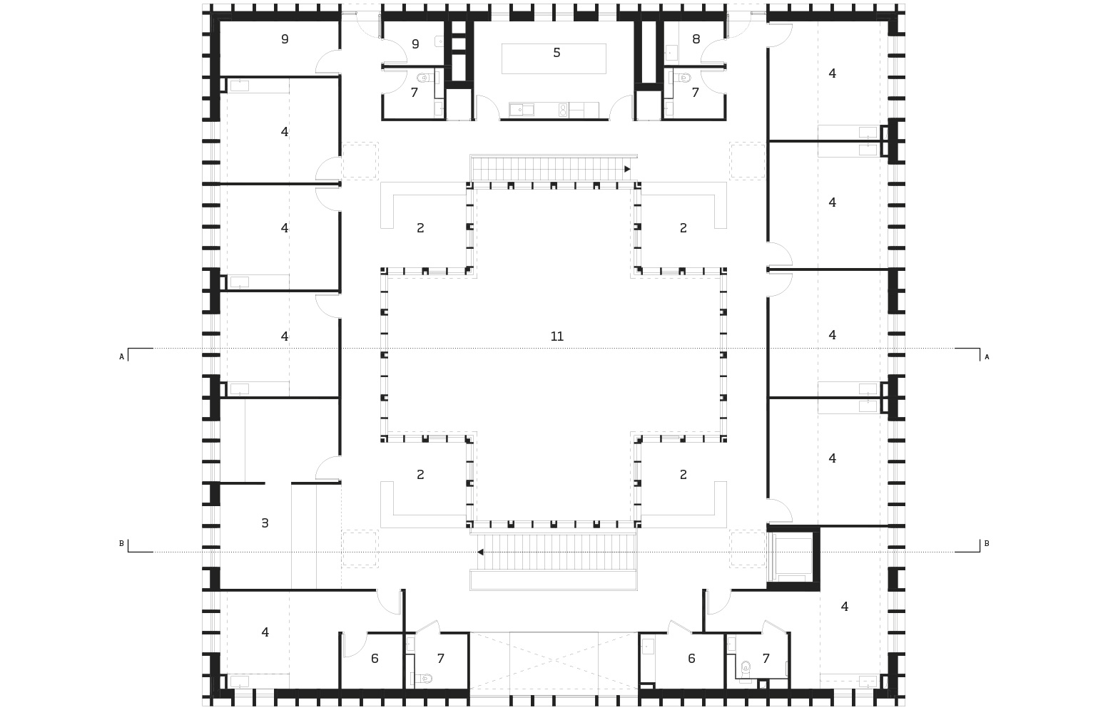 Arkitekterna började skissa på en fyrkantig konstruktion helt av trä, utformad runt en central uteplats. De lät sig inspireras av forntida kloster och organiserade interiörens rumsligheter i förhållande till gården.