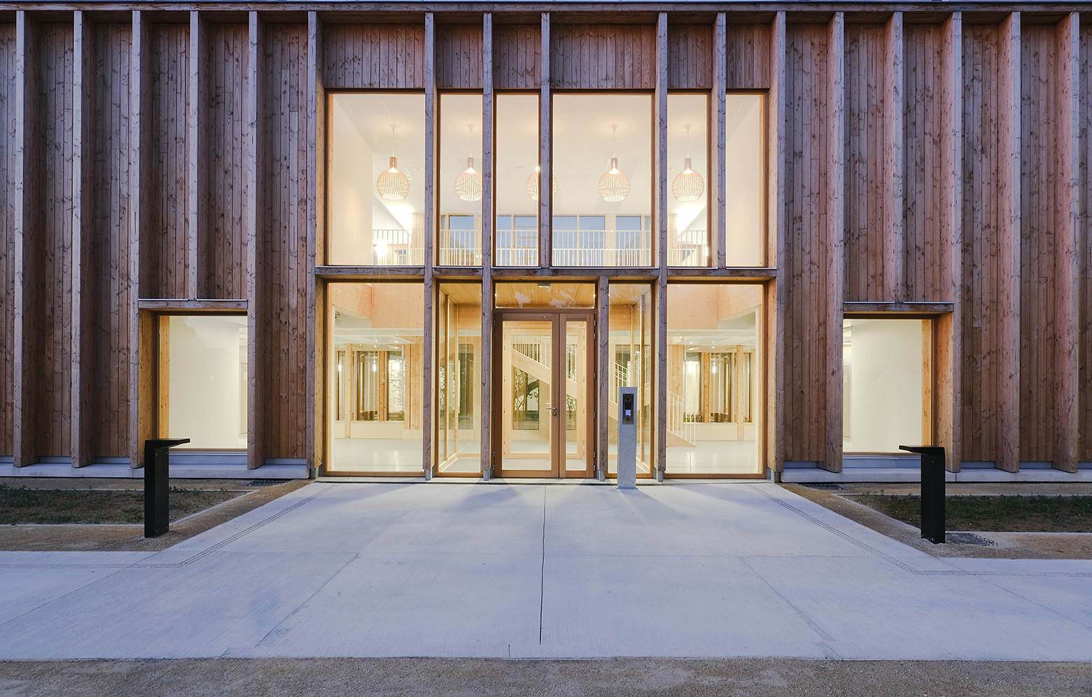 Den bärande konstruktionen är tillverkad av limträbalkar av douglasgran, bjälklaget mellan de två våningsplanen är tillverkat av KL-trä. Det fyrsidiga taket är konstruerat av traditionella takstolar, också de av gran. Alla ram- och väggelement är prefabricerade på en snickerifabrik i nordöstra Frankrike, knappt 20 mil från Taverny. Virket kommer från franska skogar i regionen Jura, intill gränsen mot Schweiz, och har sågats i lokala sågverk.