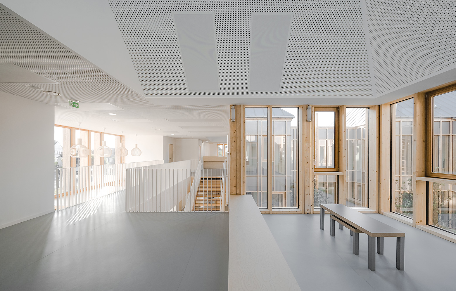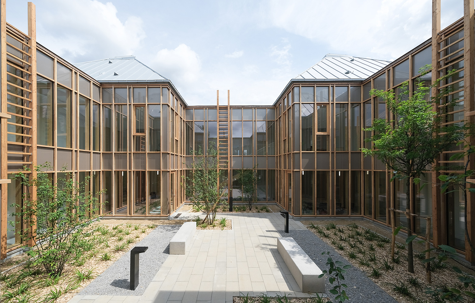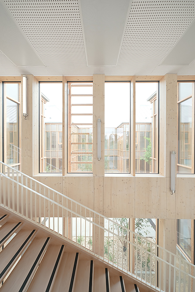 – Vi försöker alltid att vända utmaningar till fördelar, och det här var ett sådant tillfälle. Departementet krävde att det måste finnas en direkt anslutning mellan tak och innergård, varpå vi bestämde oss för att designa trästegar som integrerades i uteplatsestetiken, som en central och nödvändig komponent av arkitekturen, säger Marc-Antoine Richard-Kowienski.