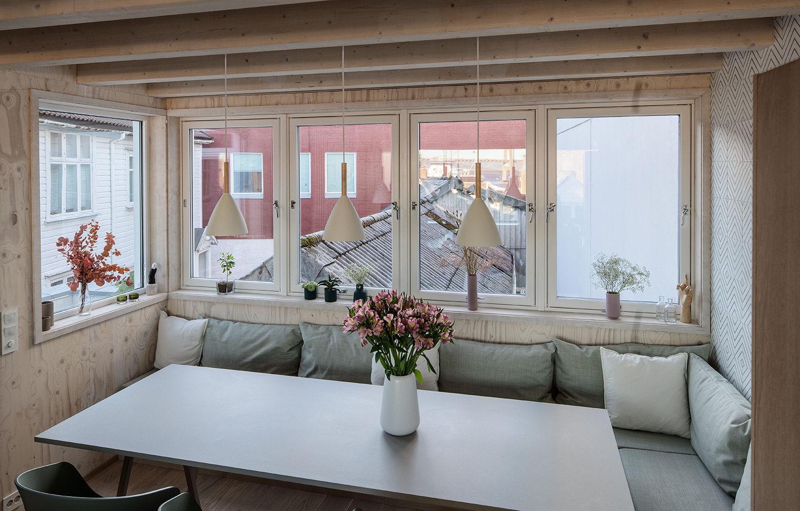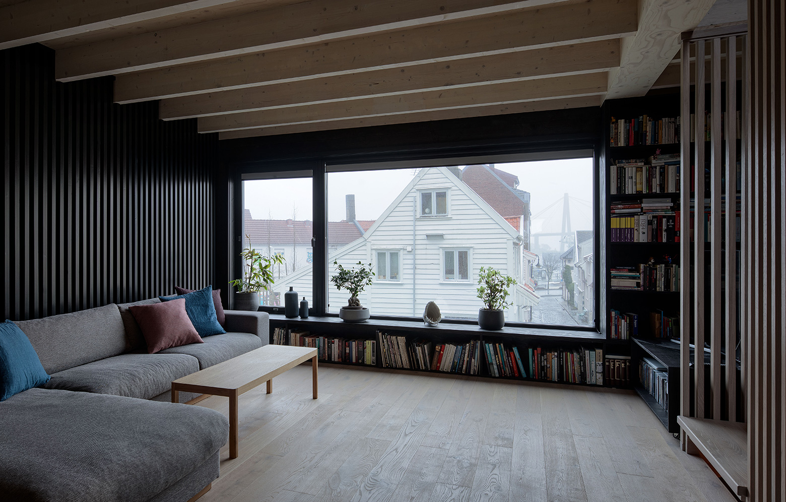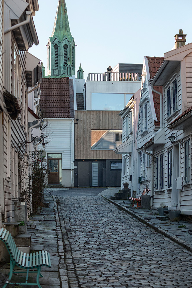 I nordiska kuststäder fanns länge en tradition av att placera bebyggelsen tätt. På så vis skulle husen skydda varandra mot kargt klimat och bidra till ökad energieffektivitet. Så småningom fick husen i städernas förorter emellertid större tomter och därmed längre avstånd mellan varandra. Med den ursprungliga idén i åtanke byggde Austigard Arkitektur för fem år sedan ett nytt hus, insmuget på en liten yta mellan två hus i Stavanger. Förtätningen blev möjlig tack vare en genomtänkt arkitektur med stora ljusinsläpp. Detta blev startskottet för att fortsätta att utveckla staden med tätare bebyggelse, och nu har samma byrå utifrån tidigare idé bebyggt ytterligare en av de tidigare tomma tomterna. Även den här gången är det 90 kvadratmeter stora bostadshuset genomgående av trä, och fasaden av furu har fått tre olika uttryck, ett för varje våning. Allt avslutas med en takterrass.