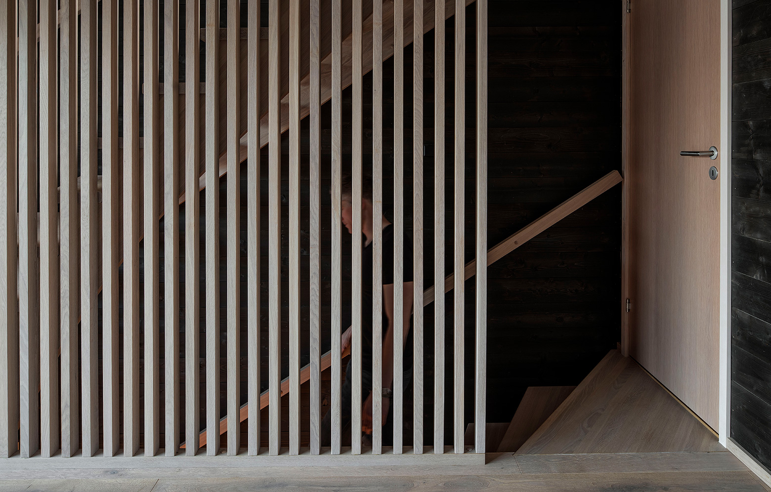 I interiören är träet flitigt exponerat med väggar av björk och golv av ekparkett.
