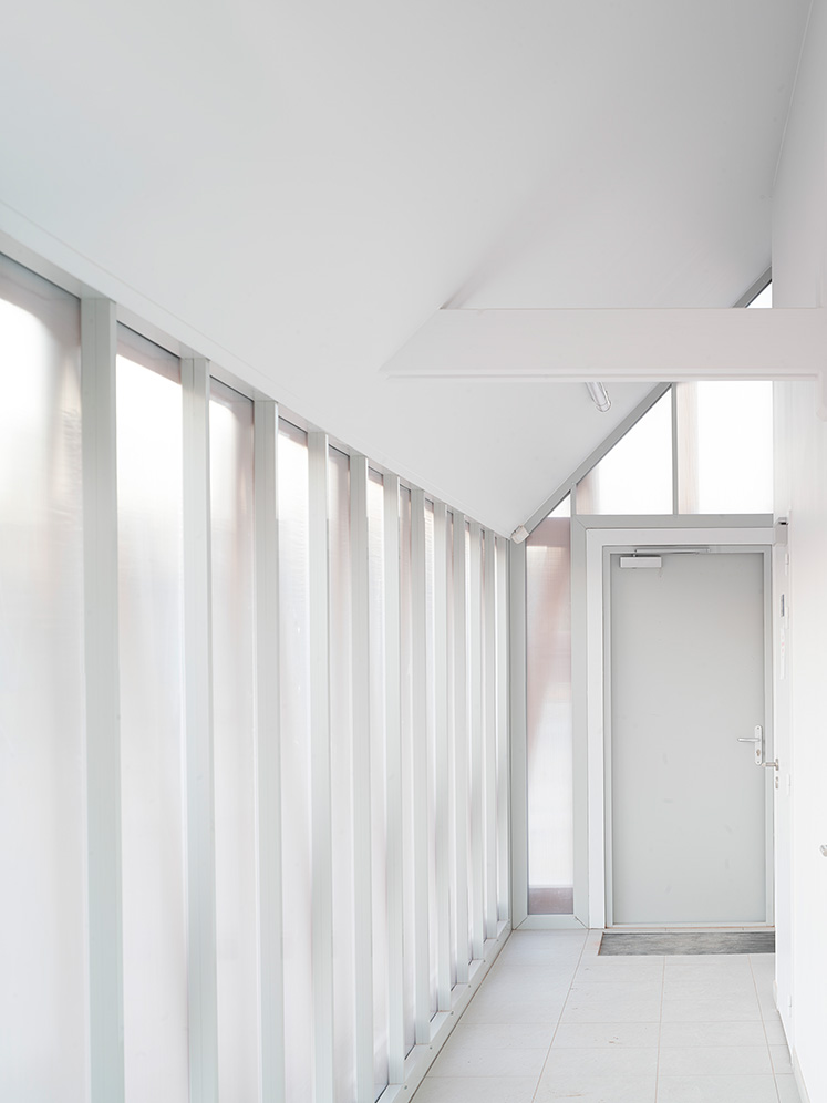 Den enkla volymen består av ett timmerskal, format utifrån korsvirkes-principen men med en modern twist och anpassat till byggnadens ändamål. En viktig skillnad är att utrymmet mellan virket inte har fyllts ut. Ytterväggen sitter i stället alldeles innanför timmerkonstruktionen. Den är av lätt isolerande opak kanalplast av polykarbonat. Materialet fyller två viktiga funktioner: interiört släpper det in tillräckligt med ljus för att tennisspelarna ska kunna njuta av dagsljuset, och sett från exteriören skyddar det mot insyn. Taket är av terrakotta.