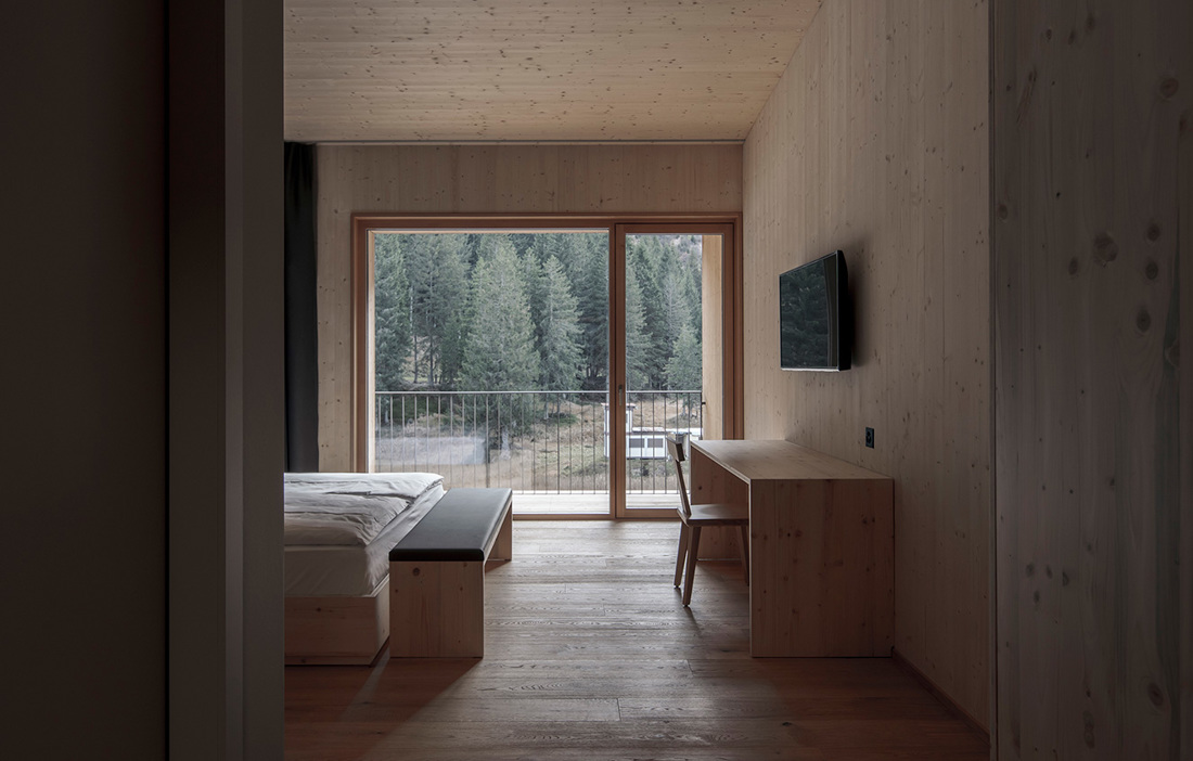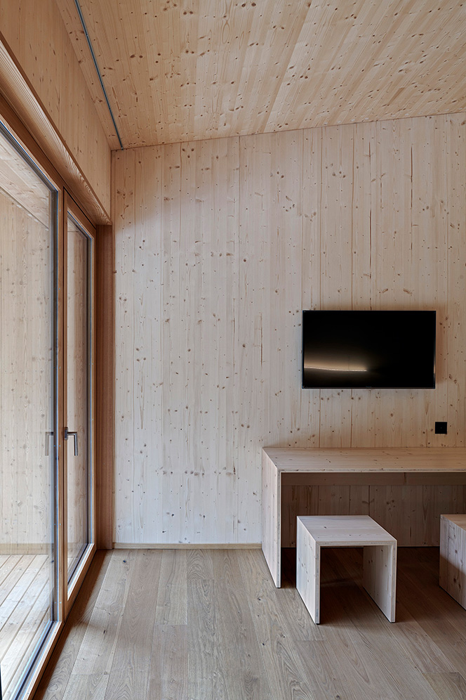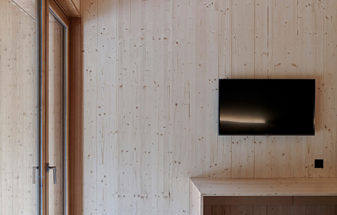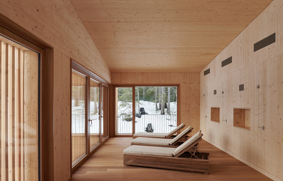 Källarplanet av betong rymmer omklädningsrum och service-center. Därovanpå är allt av trä, som till stor del lämnats exponerat. Bottenvåningen innehåller restauranger och andra gemensamhetsutrymmen. För att rummen lätt ska kunna anpassas till större sammankoster är väggarna flyttbara. Övre plan består av sovrum samt spa. Konstruktionen i KL-trä och limträ utgår från ett 4,6 meter brett modulmått. Därmed kunde byggprocessen rationaliseras. Allt för att skidåkarna snabbt skulle kunna nyttja de nya faciliteterna.