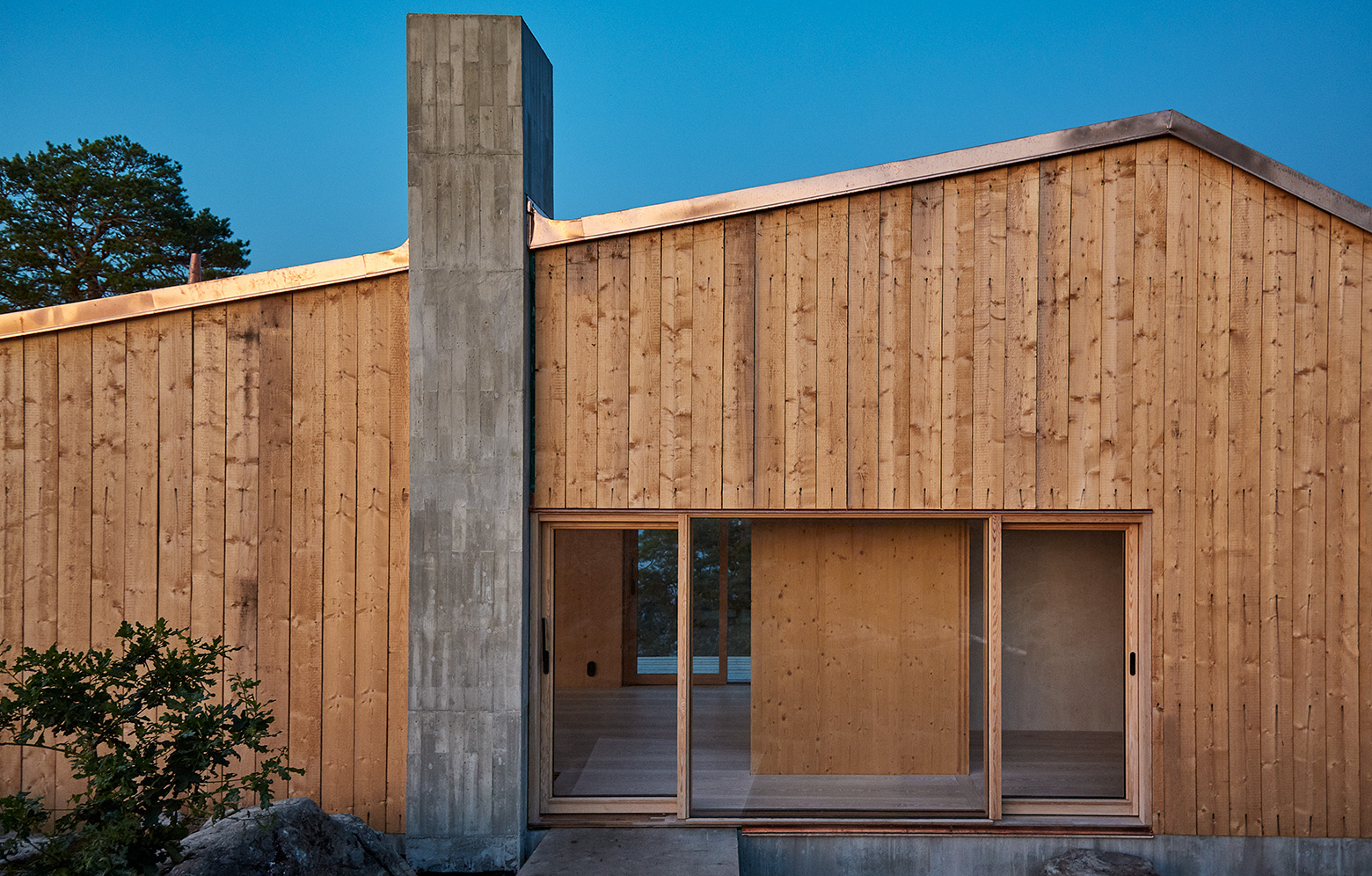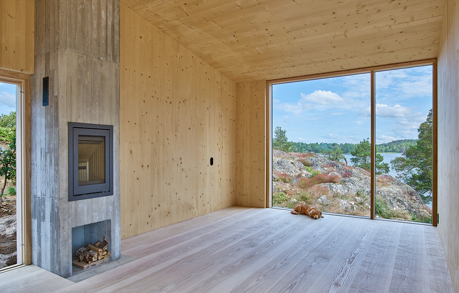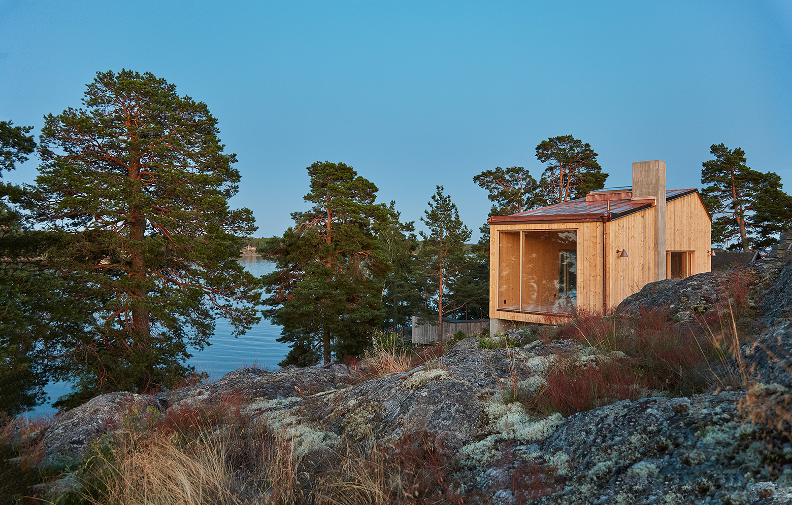 På en udde med utsikt över Stockholms södra skärgård har en ateljé elegant smugit sig in bakom tallar och klippformationer. Ateljén ska vara en privat sfär vid sidan om huvudbyggnaden, och med en golvyta på 40 kvadratmeter fungerar den som ett komplement. Husets tre sovnischer är pusslade runt en gemensam kärna, i vilken en trappa leder upp till sovloft och badrum. I kärnan ryms badrum och teknik. Tack vare väl tilltagna fönster med utsikt och stora ljusinsläpp kommer naturen nära. Stommen är av KL-trä, med insidan exponerad. KL-träelementens livliga yta kontrasterar de breda golvbrädorna av kvistfri ask. Exteriörens ram-sågade granpanel är fäst med dragen klippspik och harmoniserar med taket av koppar som ska klara den vindutsatta platsen.