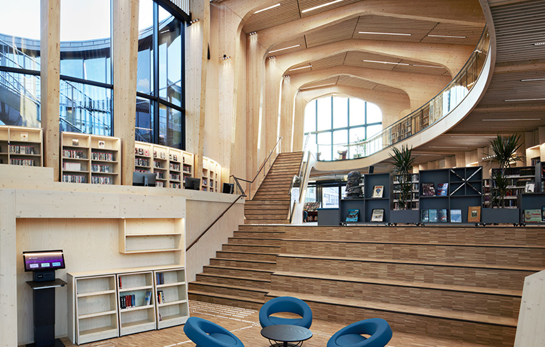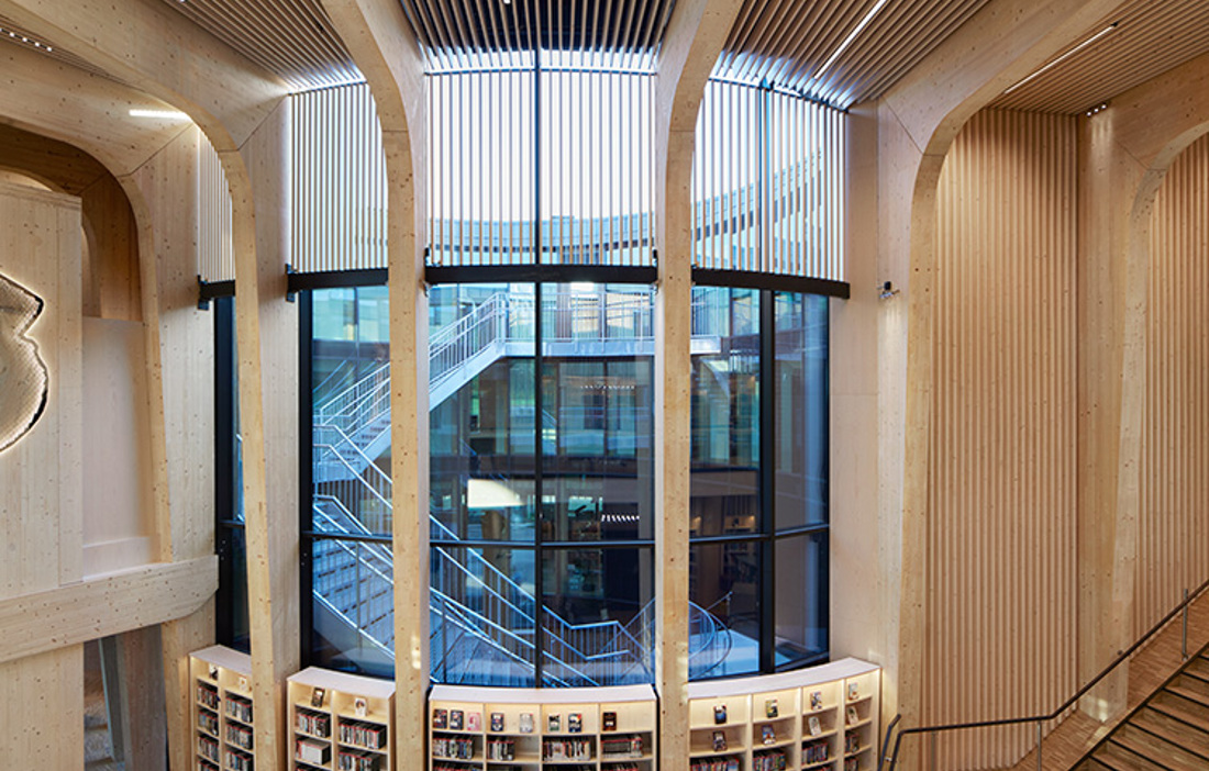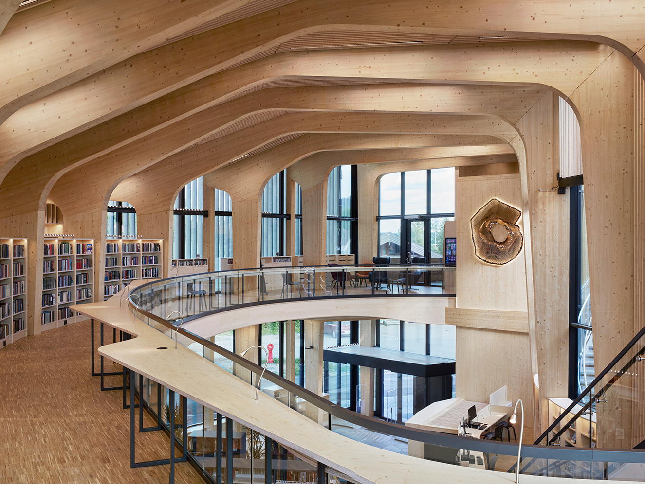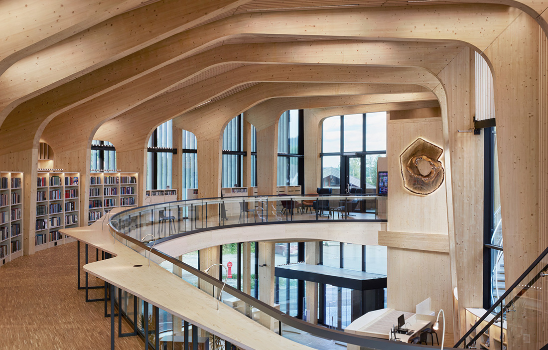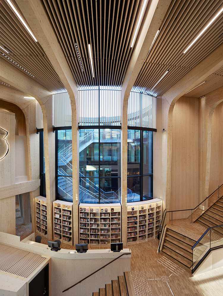 Biblioteket består av två våningar, uppbyggda kring ett atrium, vilket lämnar högt i tak och låter den exponerade stommen av limträ med sin varsamma kurvatur sätta prägel på lokalen. De tekniska armaturer som har integrerats i innertaket döljs av späda lameller som fortsätter ner längs väggarna och tillsammans med bokhyllorna formar en helhet. Lamellerna fungerar också som solskydd framför fönstren.