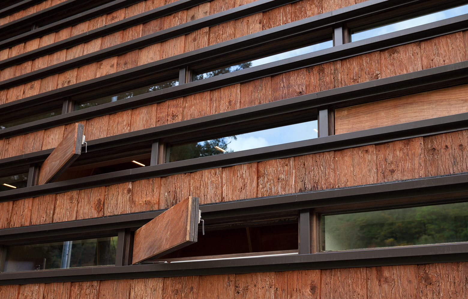 Konceptet bygger på att använda lokalt timmer, som med en nyutvecklad CNC-maskin formas på ortens sågverk. Gavlarna placeras mot norr respektive söder och långsidorna löper längs de omgivande bergen, för att både fungera som vindfångare och för att ta tillvara dagsljus och få en bra ventilation.
