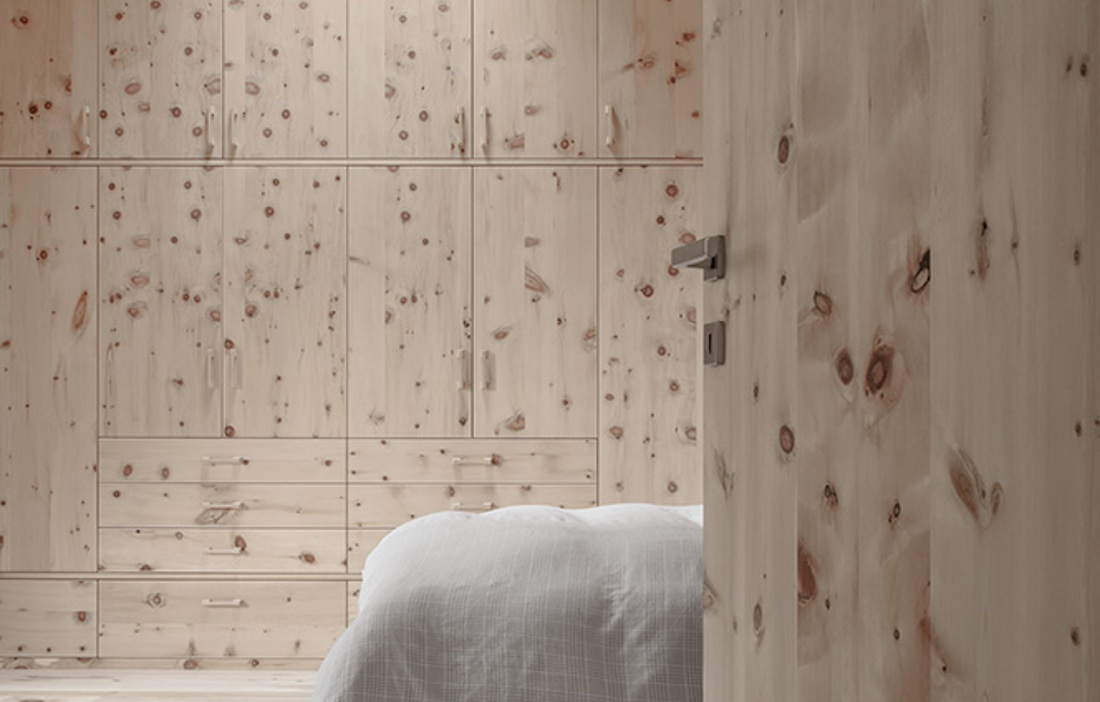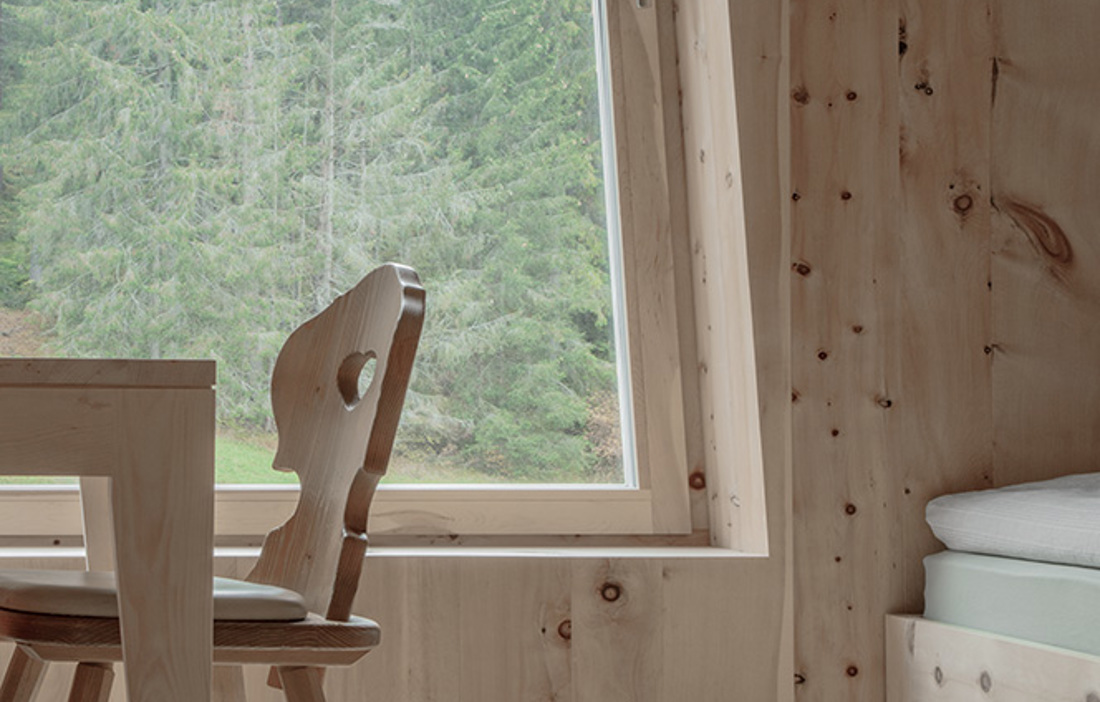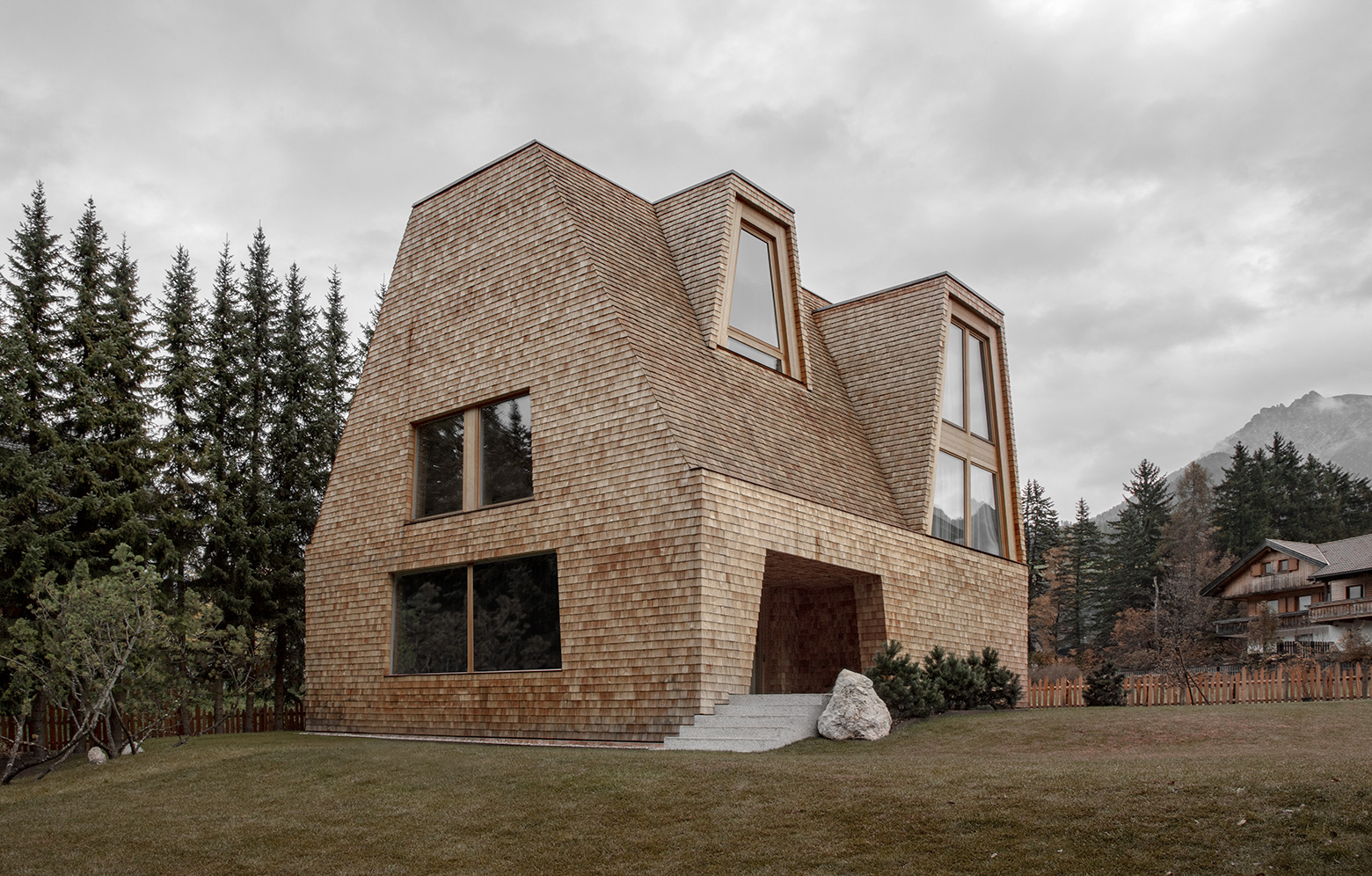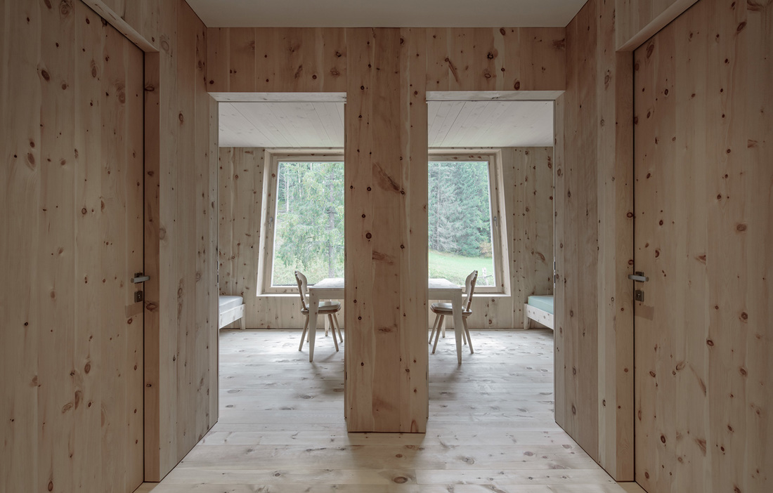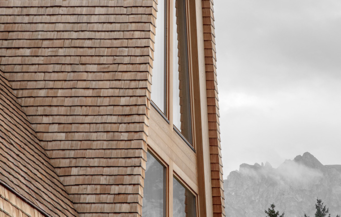 För drygt två år sedan, i slutet av oktober, drog en kraftig storm genom Enneberg i Sydtyrolen, och många träd föll. Delar av det virket återfinns i dag i en av områdets villor. Konstruktionen till de tre våningarna är helt och hållet gjord av de granar som då föll och som har kapats till 60 millimeter tjocka plankor. Timret har därefter utan lim fogats samman till 360 millimeter tjocka väggar. Tack vare den väl tilltagna tjockleken behövs ingen extra isolering. Det interiört synliga lagret av de massiva elementen består av handhyvlat pinjeträ som formar innerväggen. Fasaden och taket upplevs integrerad med sin klädsel av handkluvet takspån av lärk. Det skapar en monolitisk silhuett i landskapet.