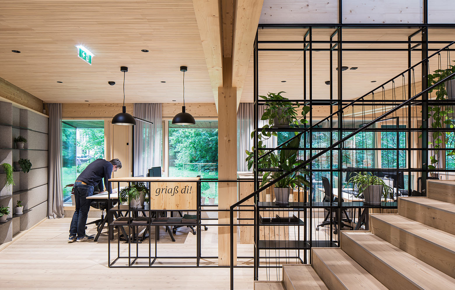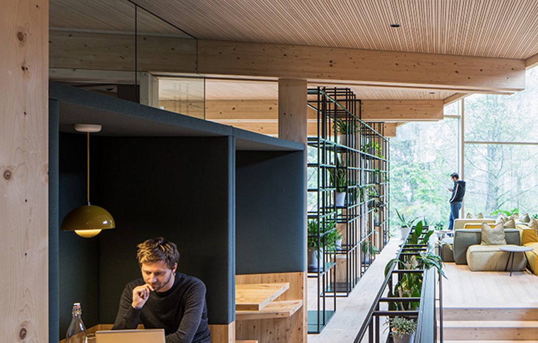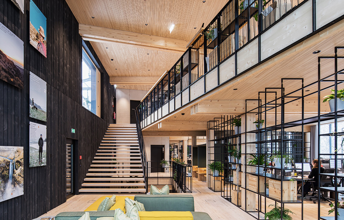 Den fyra våningar höga byggnaden har fått en materialsnål konstruktion som kombinerarar ramar i limträ med KL-trä, främst i bjälklaget, och i den öppna planlösningen exponeras det ljusa träet i väggar, golv och tak, kompletterat med detaljer av svart stål.