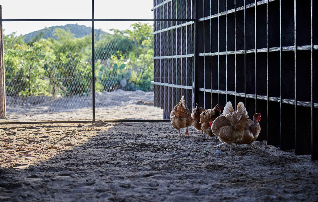 Även hönor behöver en vacker och vilsam plats att slå sig ner på. Det tog Kengo Kuma fasta på när den mexikanska konstnärsstiftelsen Casa Wabi ville ha en skyddad plats för sina höns. Det nya hönshuset har utformats som en paviljong, där sammankopplade träskivor med en tjocklek på 30 millimeter bildar ett rutnät. Varje ruta fungerar som ett rede, där ett stålnät längst in ersätter ytterväggen och skapar ljus- och syreinsläpp. Träet har behandlats med shou sugi ban-teknik, vilket gör det hållbart och motståndskraftigt mot till exempel insektsangrepp och fukt.