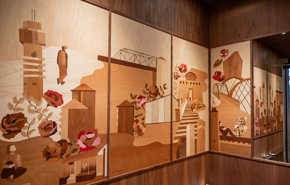 Det är en sällsam känsla att stryka över den plana ytan samtidigt som ögat uppfattar olika nivåer och dimensioner. Detaljrikedomen är imponerande. Här finns rosor, där varje blomblad sågats ut, och människor som bokstavligen pusslats ihop bit för bit. Verket ser ut som en helhet, som en enda stor bild, men består egentligen av åtta separata paneler som sammanfogats med tunna trälister. Att få allt att passa ihop var en utmaning.
