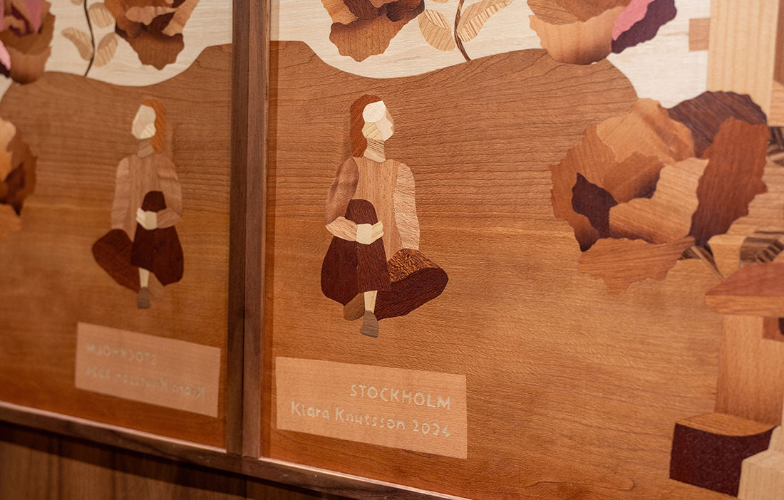 Och det är precis vad hotellet gjort genom samarbeten med arkitekter, designers och konstnärer. En av dem är Klara Knutsson, som klätt hissen med Stockholmsbilder i intarsia, termen kommer från italienska ”intarsio”, som betyder ”inläggning” eller ”inpassning”.