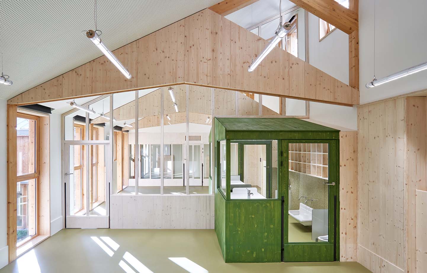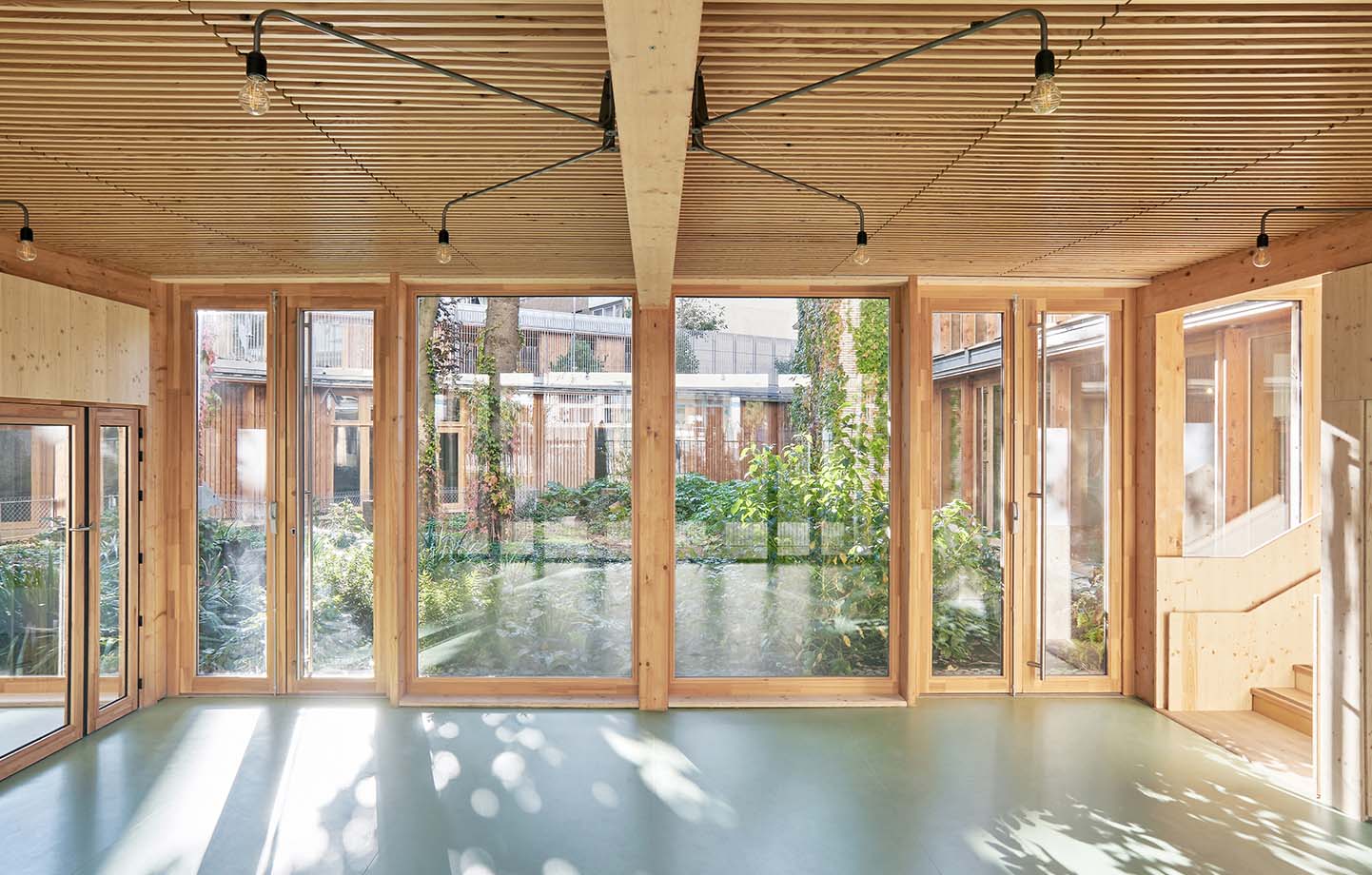 Själva byggnaden är utformad som ett atrium runt denna grönska, med två verksamheter som speglar varandra: en förskola och ett centrum för mödra- och barnhälsovård. Mellan dem öppnar sig ljusa, genomgående entréer som bjuder in besökare att vandra rakt genom huset till den inre trädgården.