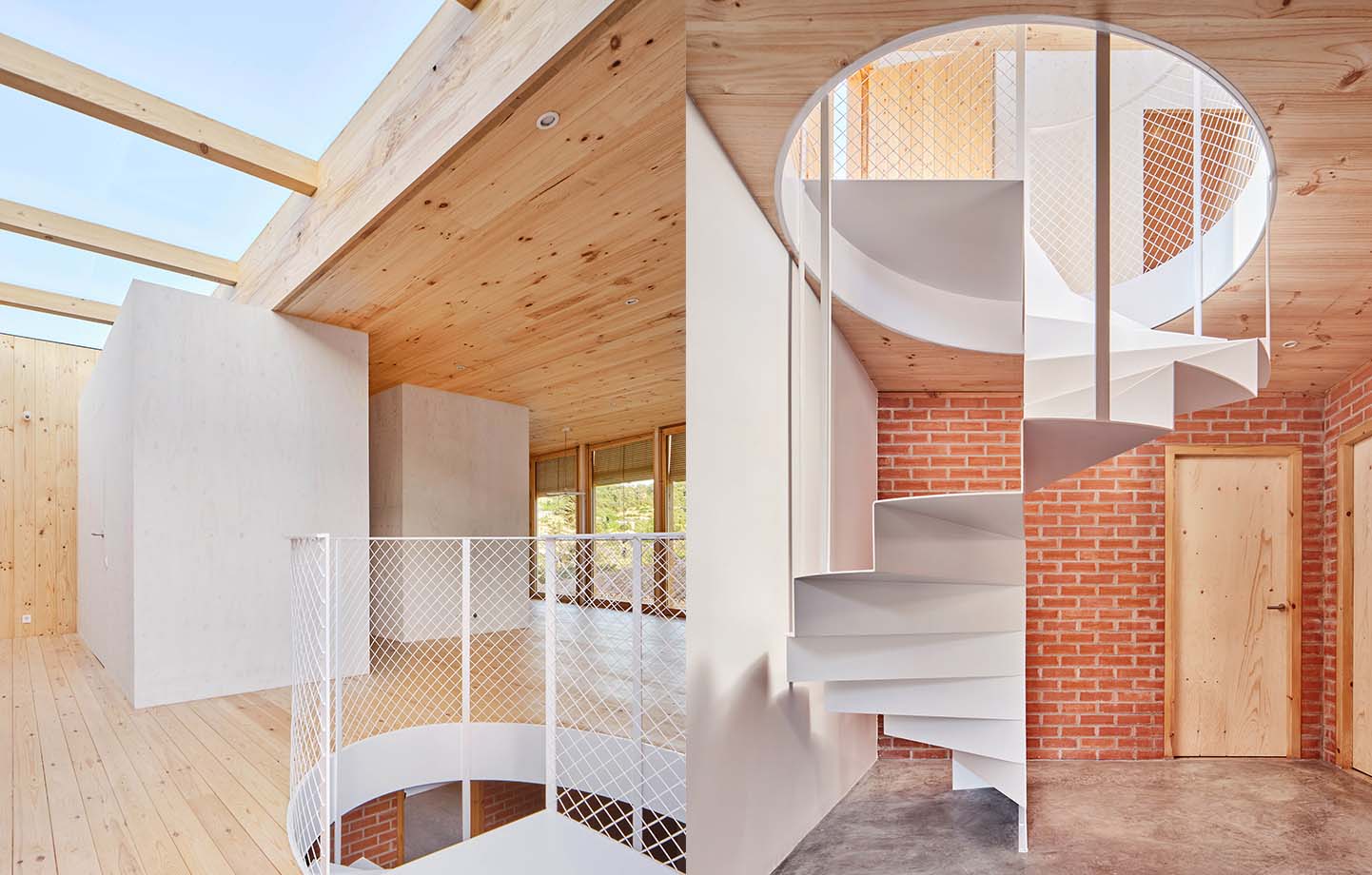 För tillbyggnaden av trä, med en area om 160 kvadratmeter, har arkitekten använt prefabricerat korslimmat trä för att skapa en modern struktur. Den upphöjda träbyggnaden är klädd med vitkalkad kork, ett av världens mest miljövänliga material.