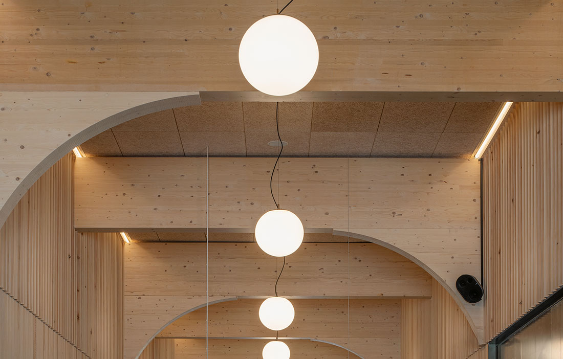 Stommen är synlig utvändigt, och invändigt är de bärande träpelarna utformade med dekorativa kapitäl. Maria Nyström på Zenisk har formgivit en unik armatur, för Atelje Lyktan, som bidrar till att pelaren upplevs som en klassisk kolonn, säger Rickard Stark.